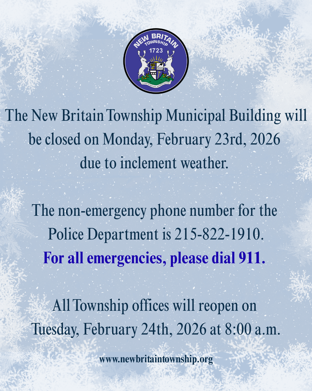 Home Resources News New Britain Township Building Closure - Monday February 23rd, 2026 Municipal Building Closed Monday 2/23/26 due to weather conditions and will reopen Tuesday 2/24/26 for normal business. Feb 22, 2026 General News General News Events Holidays Police All Articles Recent Articles Callowhill Road Closure Imported Praying Mantis - A PROBLEM for your butterfly friends! Road Closures for Utility Improvements Resources Calendar Contact & Directory Documents, Forms & Permits News Site Map Website Feedback New Britain Township 207 Park Avenue Chalfont, PA 18914 Phone: 215-822-1391 Fax: 215-822-6051 nbt@nbtpa.us Hours Monday-Friday: 8:00 am-4:00 pm View Contacts & Directory