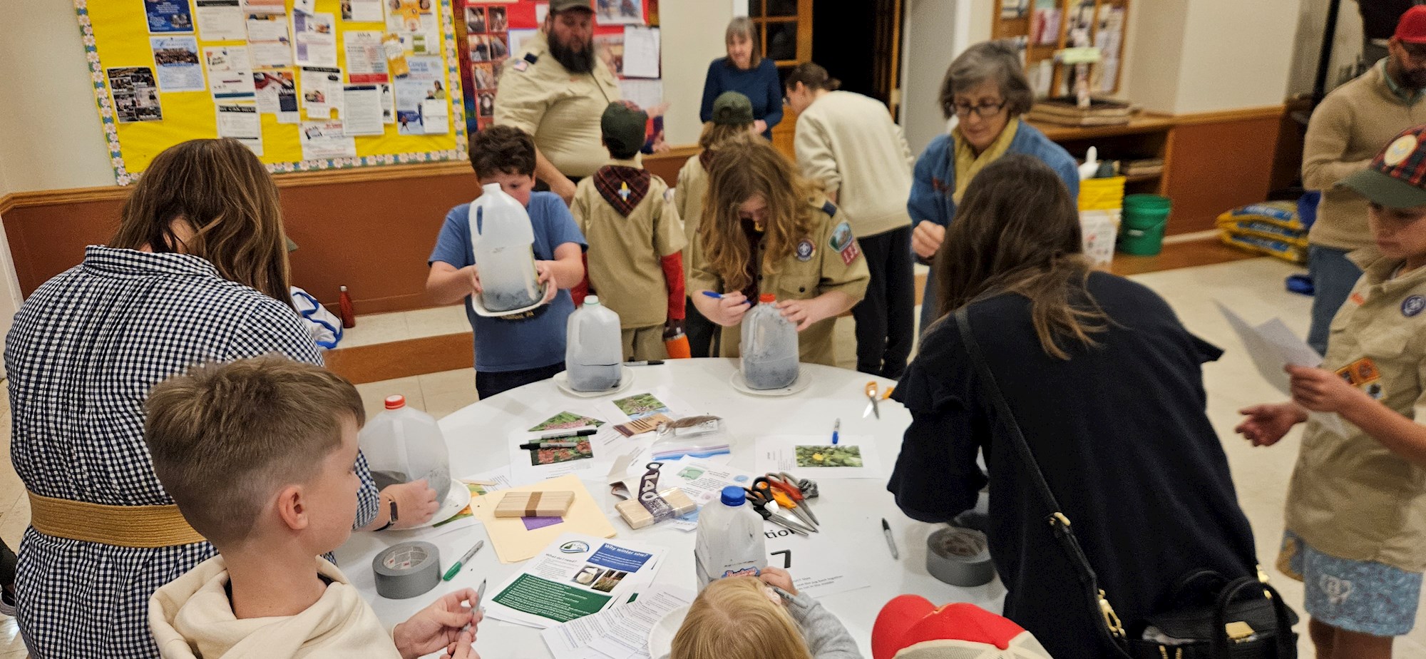 Moving through the stations of cutting jugs, filling them with soil, choosing and planting seeds and then labeling the jugs, the Scouts had their mini-greenhouses ready to go home with them. At home, they were to place them outside in a sheltered location until Spring, when the seeds germinate as conditions warm.